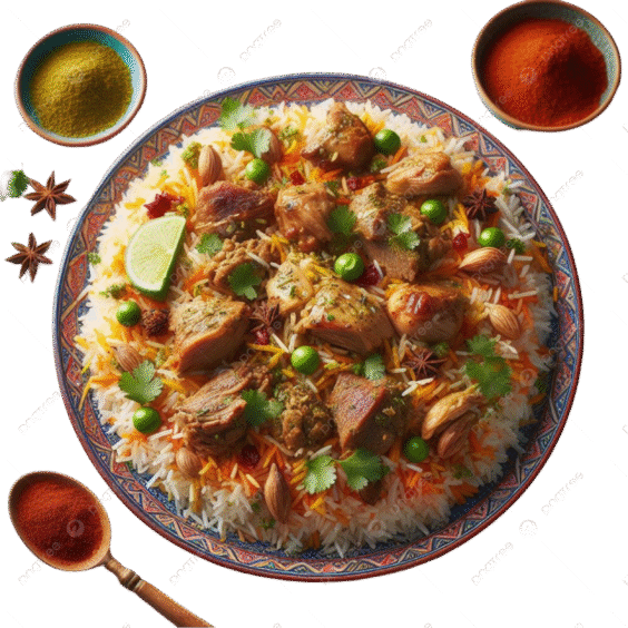 goat with fragrant basmati rice, topped with eggs and enriched with almonds, raisins, onions and bell peppers. Infused with aromatic spices, herbs and served with raita.